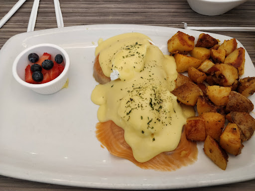 The menu is well-designed, making it easy to find what you're looking for. It includes classic breakfast items such as eggs with a side of protein, omelettes, and eggs benedict. Additionally, the restaurant offers signature dishes like the trifecta. The Keto Breakfast plate option is also an excellent choice for those who are watching their intake or the Garden Fresh Veggie Omelette for a vegetarian option. Another favourite is the Eggs Benedict with Smoked Salmon. The portion sizes are decent, and the quality of the food is consistent with other Eggsmart locations. Their cold beverages, like the Mmmmango Smoothie, come in a take-out cup which makes it easy to grab on the go.