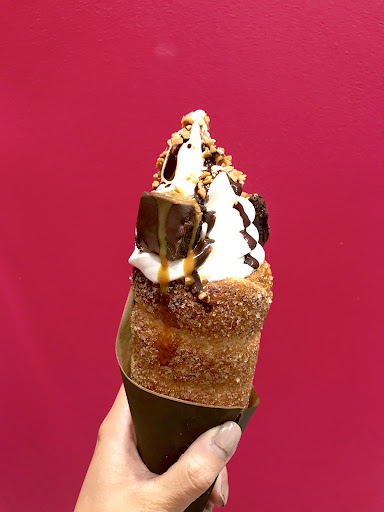 Their chimney cones!! All their cones come with the signature chimney cake that’s filled with vanilla soft serve ice cream. Then it’s topped with ingredients inside the cone as well as on top of the ice cream. All the ingredients seem like a good choice for the chimney cone!