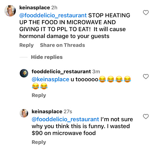 I addressed my concerns and he apologized but what pissed me off even more was this comment that was left by this restaurant on social media under my comment and concerns. Laughing at a customer’s concerns is never ok. I left the comment below for you to see.