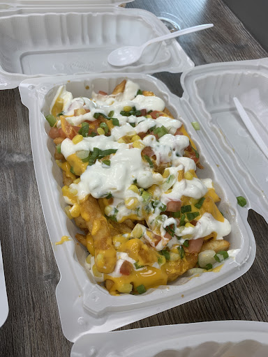 After assembling the burrito (thinking by the sheer size she may have given me a large burrito), the fries came out of the fryer fresh and hot and topped with cheese sauce (typically three ladles of sauce but I just wanted one), tomatoes, chopped green onions, corn and doused with their spicy burrito sauce.