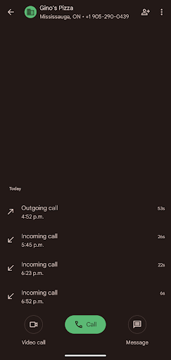 Read moreI honestly wouldn't bother ordering ahead online, because you'll just get multiple calls asking if you can show up earlier - and calls to continuously ask you whether or not you are close. I made an online order to be picked up at 6:45pm. I was called once by "customer service" (not shown on this screenshot, it's from another number) to ask what my order was even though I placed it online so they could see that , then I was also asked to verify the location I was picking up from, again, information they already had. I was then called again to ask if I could pick it up early, in which I said no... I made it for 6:45 for a reason; I was driving back from Milton in the early evening traffic. As I'm still driving back, I get another call asking if I was coming or not. Again. Yes. I'm on the way. I got another call from a different number, so I called Gino's (the outgoing call) and said yeah, I'm 5 or so minutes away, I'll show up.