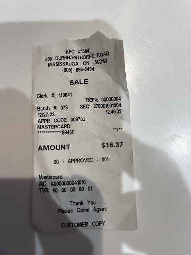 Read moreI had ordered the 4 piece chicken combo. When the box arrived, I checked and i was shocked at the chicken pieces, they were black and burnt. It looked like they were re-fried chicken , extra greasy, burnt and black. I complained to the worker, an Indian girl. She brought back another box 10 minutes later which had 2 of the pieces extra greasy and burnt. I told her, once again, that the chicken was burnt. She started yelling at me, in a very loud voice, insisting that they were not burnt. She kept on shouting at me in front of 4 other customers in the store, shameless girl. I insisted I wanted my money back which she was not willing to do. Eventually she gave me a refund and I left the store with my family.