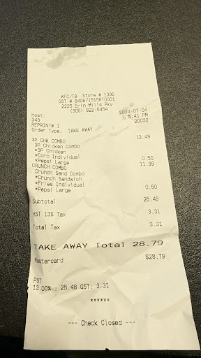 Read moreDid an online order (pick up) Jan 10, 2025. (Picture of order included so they canât say this is some bogus review) When i got there for pick up the wait time was around 20+ mins. Upon getting home, started eating and on first bite found a long thick strand of hair in the burger (picture included) totally killed everyoneâs appetite. Went back to the store to ask for money back but there was no manager onsite according to the staff i spoke to (Prerna) so they took my name and number and said the manager (Jaspreet) will call me back the next day. There was never a call back hence Iâm writing this review. Aside from finding hair on the food i find that the rest of the it was very oily, like dripping out of the meat.. way too much than normal. Will not go back to this kfc again. For anyone reading this review best to stay away from this store and look for another one.
