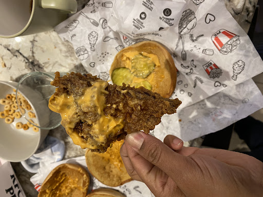 Read moreVery disappointed in the staff and service here. There were 4 other customers in the restaurant and somehow it took 28 minutes for 3 employees to put together a pickle box combo. After I ordered and paid I was told there were no pickle chips (part of the reason I was even there) and that I could have either coleslaw or macaroni in its place. I asked if I could have onion rings instead but was told I'd have to pay extra. After making a bit of a fuss, I was finally told I could have extra fries instead. Not much of a win, but the cold fries were still better than that radioactive coleslaw or the slimy macaroni. I'll be honest, the pickle big crunch sandwich was actually pretty good and who doesn't like some popcorn chicken. I was also pleasantly surprised by the pickle pepsi despite the poor presentation. (They give you a little cup of pickle juice & 2 pickle slices to dump in your pepsi.. Lol!) Something that should not have tasted good but somehow it did. I feel like this whole meal would have been better executed by literally any other KFC in the city. The half unwrapped sandwich and fries haphazardly thrown in the box didn't exactly scream "We care about your food" but maybe I should just lower my expectations for a place like this. Don't go here if you're hungry and want to eat within 25 minutes...