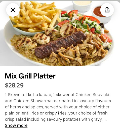 Ā Ā Ā Read moreDo not go to this location. They skip out on quality and blame it on traffic of the store. I did an Uber eats for a shish taok Platter (spelling is off im sure sorry). The potatoes-undercooked. The chicken-shredded up and hardly any of. Not worth 23$. I called the store to clarify if they made an error but to my surprise the associate said "we are so busy so we cut up the chicken and grill it" I expressed how it wasn't worth the money paid and she continued to make excuses. I let alot slide but the protein inside wasn't worth more than 13$. Save yourself a trip and go to a family business that will take pride in their quality of food and be grateful for...
