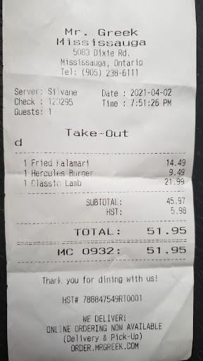 Read moreVery clean, & portions are well-sized - and that's about it. I don't expect gourmet food from this chain, but I do expect a resemblance to Greek food. Prices are only shown in the menu (not on the board or on the walls) and even there without $ signs or other ways of easily distinguishing them from all the other info nobody cares about. They seem to have switched over from lemon potatoes to ones cooked in a bland tomato sauce (very poor); salad tasted like mildew (either veggie bag or sauce was dangerously stale, but they served it anyway); 'tzatziki' here means '18% sour cream without anything added for flavour'; meat is dry; took them 15 minutes to prep souvlaki dinner, with no other customer waiting. If they're merely reflecting a chain-wide change in quality & selection, I feel sorry for the franchisee. In any case, I am not going back again - and likely foreswear all Mr.Greek locations from here on. AND the food is expensive, compared to all the (hundreds of) other places in the...