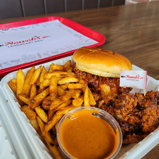 In the middle of a very populated restaurant haven at Eglinton and Platinum Drive, on the border of Mississauga and Milton, you'll find that Nawab's lives up to its legendary tagline. For lunch, I had the combo #3 that had a chicken slider, a chicken tender and fries, all of which clocked in at $21 including tax. The chicken slider sounds small, but it is actually a thick cut of chicken, was very juicy and was covered in sauce (just the way I like it). Although the breading of the chicken fell off too easily, it was forgivable, as the breading was very crunchy and the sandwich was absolutely delicious paired with a fluffy bun, pickles and an acidic coleslaw to add to the tastiness! I got the chicken extra hot, which I was told at the counter wouldn't exactly knock my socks off, but the sandwich had a very nice spice level which was flavourful and packed some heat. If you like a messy chicken sandwich, you're in for a real treat with this sloppy bad boy, which reminded me of a Nashville Hot-style chicken sandwich. The chicken tender lived up to its name as not only was it very succulent but it was truly tender. The crunchy, well seasoned and gigantic chicken tender was a must try. Again, the breading slipped off a bit too easily but hopefully that was an anomaly. The fries were delicious and I had the option of salted or spiced. Obviously I opted for the spicy fries and I was pleasantly surprised that there was a nice little kick and they were tasty. Lastly, the star of the show was the ample, sweet "legendary sauce" that I used to dip my fries, slider and tender. When free sauce is hard to come by with restaurants like McDonald's now charging for this basic necessity, it's refreshing to know that even a sauce boss like me didn't run out of sauce while eating this sumptuous and plentiful meal. I already know that I'm going to hit up Nawab's again because the food was so delicious, but that legendary sauce will have me coming back again and again and again. It's hard to imagine that the chicken offerings were so good at this place despite the fact that chicken isn't the restaurant's only specialty. Nawab's boasts a menu with chicken tikka, pizza, burgers, momos and kebabs. I'll definitely have to try their other food options but it'll be hard not to come back without grabbing anything without their legendary sauce. Hands down, Nawab's should be on your list of restaurants to try as based on my experience, I had a 5...