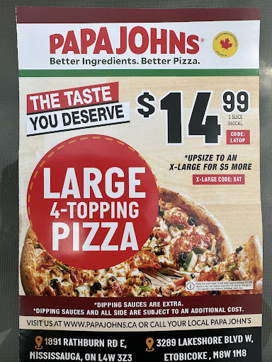 Ā Ā Ā Read moreI have been to many Papa John's locations within the US and couple in Canada. It was my first time to thelis 1891 Rathburn location. I know something was off when I opened the box ordered the Hawaiian and a Garden Fresh pizza. The pizza was missing toppings basically doe, where is the toppings is this location that cheap to nickel and dime it customers by stealing even the toppings that belong to the pizza I am paying for. Eating there felt so unsatisfactory, I had to go to Harvey's because the family was still so hungry just eating doe. Looking at the other reviews seems like everyone had similar experiences at his same location. I also mad ether mistake purchasing, the wings. The Wings were the worst wings I have ever tasted. They clearly went and bought from them lowest quality supplier. The wings had no meat they were all pure fat, I have never tasted wings like that in my entire life. Purely disgusting and very unhealthy selling fat ladden wings. I didn't think such wings were even possible.Again where the meat? Sadly this location give Papa John's a bad name. Avoid this location...