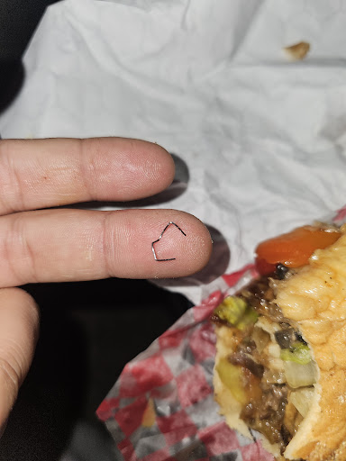 In the sandwich about halfway through the sandwich. I found a metal STAPLE as I chewed. At first I thought it might be a bone but it was a METAL STAPLE. Wedged from my tooth I pulled it out and saw the staple followed by a bloody taste from my cut gum
