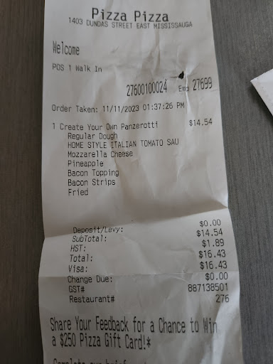 Read moreWhere do i begin.... i am new to the area and have been trying different places. i have seen pizza pizza literally every where and have been wanting to try it. 1st of all the store was not busy but was very dirty, 2nd of all the pizza was bland and tasted of low quality processed ingredients... on top of that i like to make conversation because half the experience is with me feeling like ive made someones day or someone making my day through conversation and food, but that was not going to happen with the food. Anyway as im talking to the employees one thing lead to another and i end up telling them about my little reviews that i have been doing and they end up letting me know that they make reviews about the other pizza places in the area and give them bad reviews. im not going to specify which place but i will defiantly try them and give them my honest review. after this experience i can honestly say reviews can actually effect a business alot.. and from the looks of it pizza pizza you have lost my business not only because of the food and the cleanliness but for the vibes your...