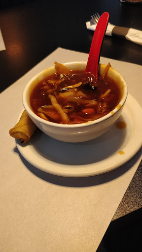 The hot and sour soup was a little spicy, as it should be, but no flavor... Which, as I found out, was a theme there. It came with a spring roll which was nice and crunchy and then a mush of flavorless filling.
