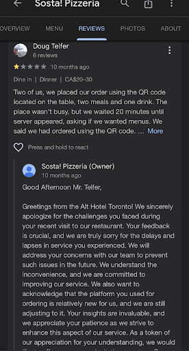 Read moreI know this review probably won’t go anywhere because past reviews haven’t been addressed (see pic). As I type this I’m watching one waitress fold and stamp pizza boxes while we wait to get another drink and dessert (going on 20 minutes now) and 3 other waiters/waitresses kind of aimlessly walk around. Luckily our flight isn’t until tomorrow … thank god because we’d miss it. At most, betting on ‘time to serve’ kept us entertained for the night.