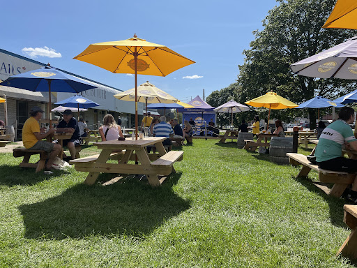 The Space Itself Inside is tiny — a few wooden tables, warm yellow lighting, and nautical everything: rope, anchors, portholes, a model ship perched above 20 taps. The ceiling is curved like a barrel, and every inch of wood feels like it has a backstory. There’s even a “Free Beer Tomorrow” sign, because of course there is. A small window nook gives you a front-row view of the brewing tanks, which feels oddly intimate. But the real crown jewel? That massive patio with picnic tables, Adirondack chairs, a gazebo, rope lights, and a firepit vibe without the fire. As the sun sets, it gets weirdly magical.