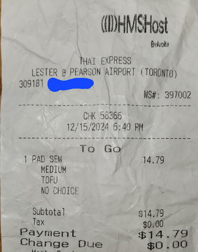 We stopped here due to a layover. I ordered the tom yum soup with shrimp which was delicious. It was supposed to be spicy but it wasn't very spicy which is fine by me since I'm not a very big Spice Girl. I do like a little bite in my soup so I did add a little Sriracha and a little oyster sauce, in addition to a squeeze of lime. The counter where we receive our food was a little messy but they were also very busy so that was to be expected. The staff was very friendly. They were even thoughtful enough to make me a fresh spring roll after noticing the others were old. They also brought out some new Sriracha when I asked. The soup was mostly noodles and not as many veggies as I would like but I did like the vegetable combination that was in the soup. The veggies were hard to get to since it was so many noodles on top. I do wish it had more bean sprouts and vegetables inside the soup. I also wish it had more of a lemongrass flavor. My mother ordered the fried Thai rice which was also very good. I was surprised it was so flavorful being that it looks so plain. It was a little pricey at $12 Canadian dollars but...