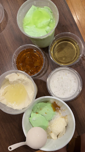 The tofu dessert was so good. The silky texture can be seen with each large spoonful. Love the fact that it comes with toppings. The sugar syrup, a ginger syrup and a coconut sago as well.