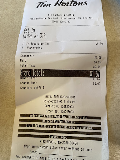 If Dharti sees me ordering, she just jumps the line and says "I'll make it for him I know what he wants". She always has a heart warming smile on her face when I interact with her. She also works at the Tim Horton's in the mall. We recognized each other at the Mall's Tim Horton's, I was initially confused and asked, and she told me that the owner of the two Timmies is the same.