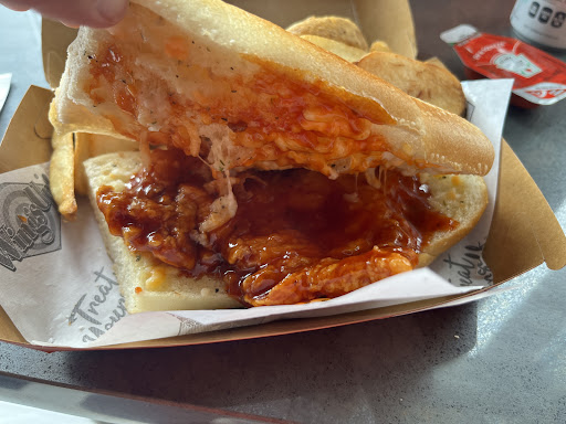 Got their Sandwich combo meal of the day(Smiley) for 9.99 plus taxes. Although I remember the sandwich being much bigger years ago it has gone with the times of “inflation” or “shrinkflation” and has become thinner. But aside from that Chicken batter was cooked perfectly crisp on the outside and soft/juicy on the inside. The bread was toasted just right and was surprisingly soft airy on the inside which made the meal feel much lighter in the tummy. You’re basically getting cheesy garlic bread style which actually pairs the best with a saucy chicken. The fries also had the right amount of crisp and seasoned well. I tried the Hot Honey today and Hot yesterday. Both flavours were awesome. I remember years ago Sweat’n Bullets was my fav. Anyways highly recommend trying the Smiley Sandwich combo, it’s only on certain days so check the website. I added .99 to upgrade to a Celsius drink so came out to $12 and change after taxes total. Definitely worth it since I came two days in a row. Will come back to try the Wings from this location and update the review.