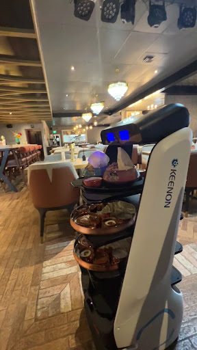 For those of you who are interested in more specifics: We had a robot sing to us; we had a tour of the space and decor (much of a history lesson) by the owner as we walked through the door, which included a viewing of the "live kitchen" where we watched the chefs prepare a version of naan (unleavened flatbread, layered and topped with spices +); we ate a delicious chicken dish as a started suggested by our host - the most tender meat with a coat of spices (not hot, but expertly flavored!!) and charred, with a yogurt sauce on the side. Our host was considerate to check in after his suggestion (A+), and he was sure to ask for our heat preferences prior to.