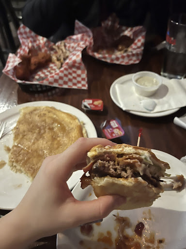 Read moreBurger: added sautéed onions was very good love it, has onion ring. Dipped in the blue cheese sauce, good for a few bite Pancake: undercooked today but usually very good Wings: 1$ wing every day. Honey garlic sauce was delicious 8/10 medium wings were 3/10 sauce not well dispersed. I didn’t think i was a wing lad but i could come here for just wings from time to time. I like blue cheese sauce on side