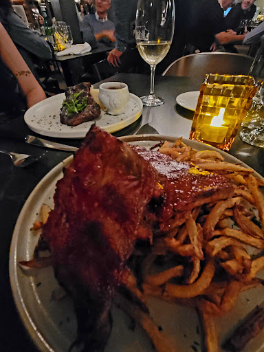 For our meal, I ordered the ribs with fries, and my girlfriend had the steak frites, substituting the fries for mashed potatoes. The ribs were fantastic—falling off the bone with a decent barbecue sauce that hit the spot. Unfortunately, the steak was a letdown. Though cooked to medium as requested, it was tough, dry, and lacked flavor. A real disappointment given the expectations set by the restaurant's reputation.