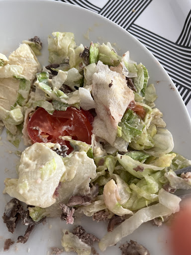 The condiments are not balanced in the sandwich. A good shawarma should have a nice balance, this one was a salad wrap. I felt like I was eating a salad as opposed to a shawarma there was so much salad in the sandwich, so many tomatoes, the little meat that they had was bland and had a weird/chewy texture, and the bread was badly wrapped.