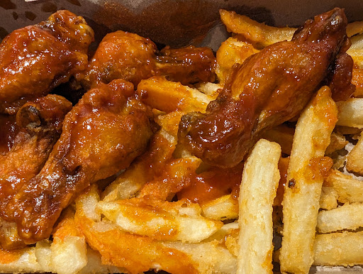 The wings are served on top of french fries and drenched in sauce. The fries and wings go straight from the fryer to the plate which is the only reason why I feel safe eating at any of the buffalo bills restaurants.