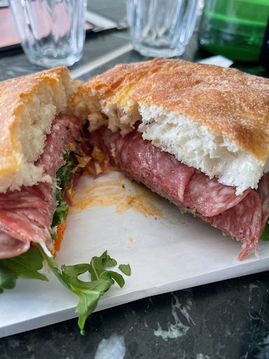 Ma camarade est à quelques minutes de se pointer le nez, alors je nous prends quelque chose de plus copieux : un beignet sucré importé d’Italie (congelé là-bas, réchauffé ici), deux sandwichs focaccia, le premier au Mortadella, l’autre appelé « le Campagnola » qui m’ont fait dire que, en plus de l’excellent café, on peut aussi adéquatement y satisfaire sa faim.