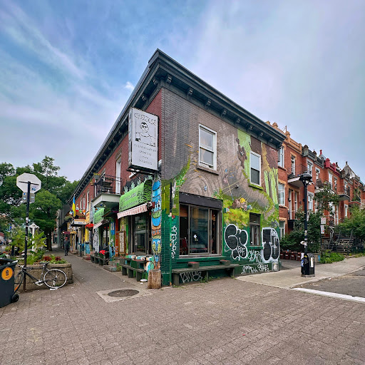 Located in what looked like a hippy neighborhood, its colorful decorations from the past century, such as old TV posters and other memorabilia, add a distinct charm. The design is truly one-of-a-kind. The atmosphere is vibrant and diverse, and the menu offers a variety of food and drinks to choose from.