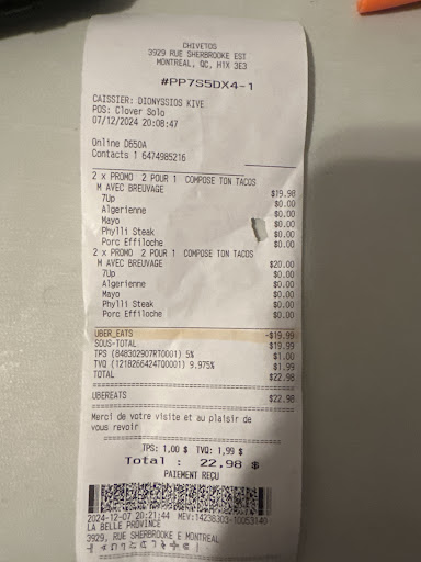 Read moreJâai fait une commande avec uber eat de 2 promo 2 pour 1 pour le prix dâun. Je reçois ma commande et jâen ai reçu quâune seule. Jâai donc appelĂ© le magasin pour clarifier la situation afin de pouvoir recevoir ce qui manquait dans ma commande. Jâai en premier lieu parler avec un employer du chivetos qui me disait que puisque jâai payer 22$ câĂ©tait illogique que je reçois un autre combo 2 pour 1. Je cite ces propos: « est ce que câest logique entre vous et moi dâavoir 4 tacos pour 22$ ». Je trouve quâil y a une autre maniĂšre de parler avec un client qui essaye de comprendre la situation. De plus, dans la facture on y vois clairement la promotion de uber eat qui enlevait 19,99$ sur la facture. LâemployĂ© mâa par la suite dit quâil va texter un gĂ©rant puisque le gĂ©rant nâest jamais en magasin. Ce qui ne fait pas de sens puisquâil devrait au moins avoir un responsable en magasin. Jâai rappelĂ© une deuxiĂšme fois Ă 21h19 et jâai parler avec une madame de la belle province qui Ă©tait au courant de la situation ( puisque les deux resto sont dans le mĂȘme endroit). Celle ci ma manquer de respect. Je lui est demander si je pouvais parler avec un gĂ©rant ou un supĂ©rieur puisque je ne comprenais toujours pas la situation. Celle-ci mâa dit « je ne peut rien faire pour toi » et mâa par la suite raccrochĂ© au nez. Je trouve que câest un manque de professionnalisme profond. Ce nâest pas une maniĂšre de traiter un client qui essaye tout simplement de comprend la situation.