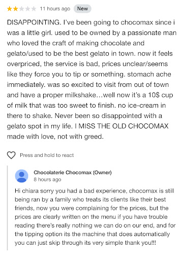 DISAPPOINTING. I’ve been going to chocomax since i was a little girl. used to be owned by a passionate man who loved the craft of making chocolate and gelato/used to be the best gelato in town. now it feels overpriced, the service is bad, prices unclear/seems like they force you to tip or something. stomach ache immediately. was so excited to visit from out of town and have a proper milkshake…well now it’s a 10$ cup of milk that was too sweet to finish. no ice-cream in there to shake. Never been so disappointed with a gelato spot in my life. I MISS THE OLD CHOCOMAX made with love, not with greed.