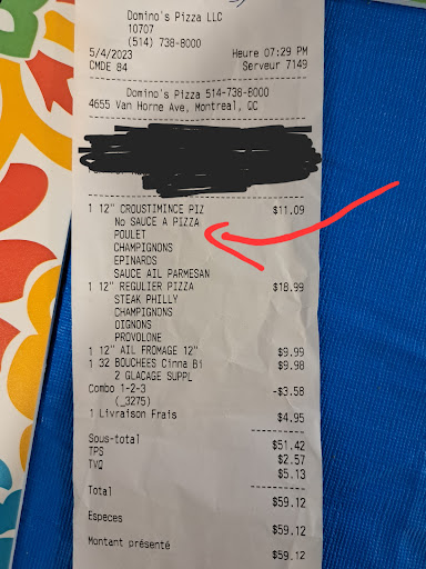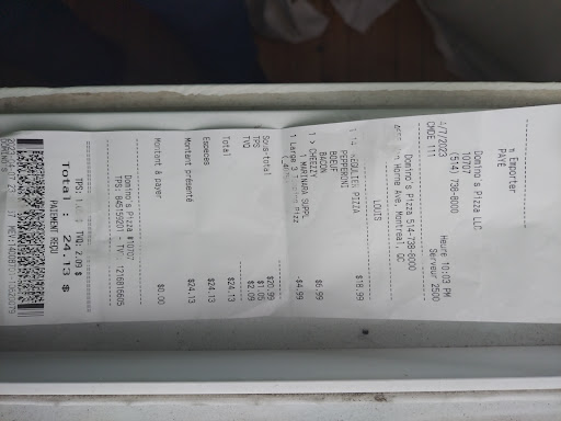 Read moreI understand that on July 2 you were understaff but it doesn't excuse this bad customer experience. I first ordered jumbo pizza without knowing that the place does not serve jumbo pizza and to receive by surprise large size pizza (the casher did not bother to mention that only larges are available and did not reconfirm the order). Furthermore, I called after giving my order to mention my phone number, but they take into account the phone number appearing on their display without bothering asking for your number - don't you know about confidential policy? I took the time to call back to give my phone number but they mentioned that they have the phone which is ok... One positive point is that the service was quite fast but upon reception of the pizza, my mom wasn't able to pay by credit card and was forced to pay debit when clearly, domino allows customer to pay whichever method they want to. Since there is many pizza around the area, I will not order at your place. I hope this review will ring a bell and help you to improve...
