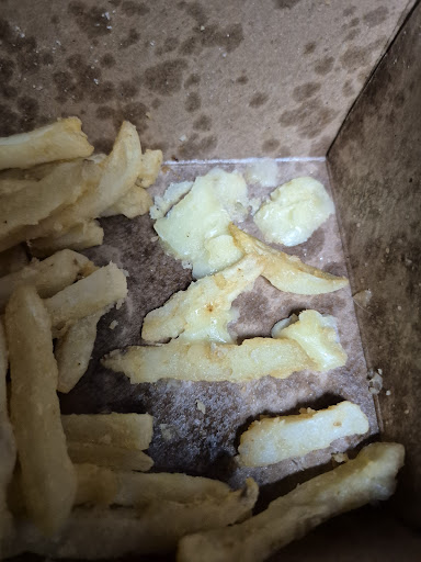 I have given this place a few chances. This time (pic) I got a med fries $3+ extra on my burger combo. They are borderline undercooked and soggy. They are under seasoned and when I got to the bottom I find cheese that was not ordered. Was it a dirty, box? Old fries previously used to make another order? Or just sloppy practices making a simple box of plain fries? What else could end up in the food if they can't sell what is intended in the box. $20 for a burger, fries and pop, and they couldn't do the fies cleanly or cooked.