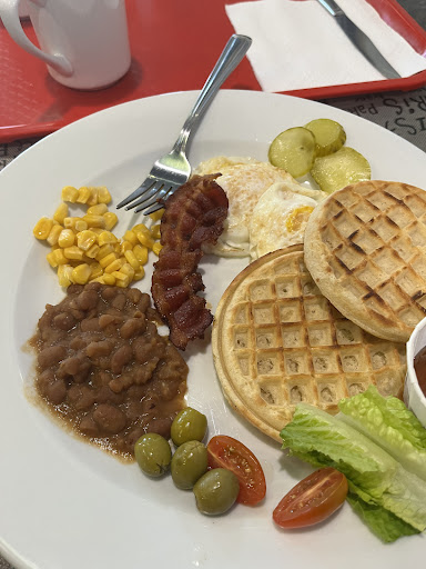 Read moreThe breakfast consisted of eggo waffles, one slice of bacon (tho it advertised two slices) various canned foods, and 2 eggs. Kind of airport-like, but the service was good. Altogether not bad for $9.99, coffee included.