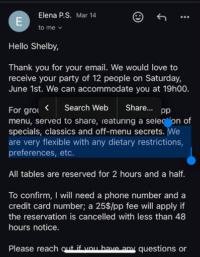 I made a reservation for 12 for my Best friends bachelorette weekend, and recut very kind very encouraging email back ensuring that they were extremely accommodating for dietary restrictions/preferences.
