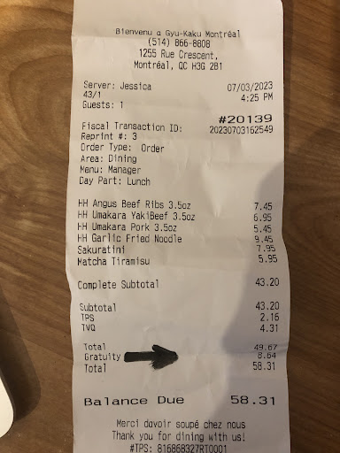 Read moreWe went to Gyu-Kaku on Monday afternoon, expecting a great time there. However, our experience with the service destroyed our enthusiasm to dine in. It wasn’t our first time eating there, and every time the service was amazing, but not this afternoon. Our waitress did a poor job to accommodate us. She did not interact nor explained anything to us about the menu. Usually, the server would come up to ask if it was our first time there, and/or would explain the menu. We took a while to decide what to order, and yet she never came to see if we were ready to order or if we had any questions. No one went to check on us regularly to see if we were alright or needed anything. Once we closed the grill and did not have any food left on our plates or on the grill, we waited for a server to come. At least 3 workers, including our waitress and the “manager”, looked at our empty table, and went on to ignore us for a while. It would have been understandable for the delay if it was a busy afternoon or a full house or even if they were understaffed, yet it was not busy at all. The table next to us was more served than us. Knowing that the restaurant has incredible service, we did not want to tip after experiencing a really disappointing one, especially when it was only the minimum service. They even proceeded to give us half of the change we asked for. The “manager” did not even ask if anything was wrong with the service or the food. We would have left some tips if she wanted to solve the situation, yet she only came with another bill (with a drawn arrow that indicates the total price with an 18% tip), tells us that the tipping is not included in the total cost, and leaves. Tipping is not an obligation,...