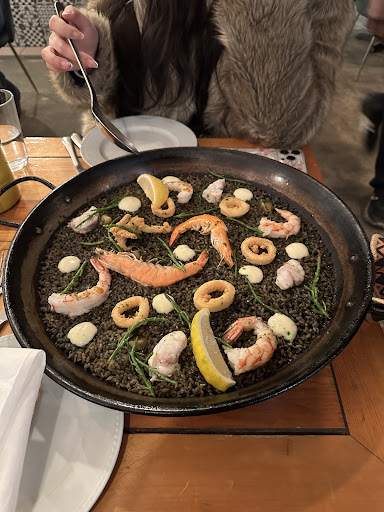 Basically, the paellas are a cash grab. On the evening menu, $27 a person for a paella (we took the negra) gets you an overly and unnecessarily humongous hot plate on your very small table, with sticky, thinly layered, almost burnt, way overly greasy rice complete with the toppings that come from your menu choice. We ate the not so great toppings (at $81 for one 3-person plate, we felt we had to) but the rice made us all sick. It was just way too greasy and heavy. And no veggies to be seen anywhere unless you ordered their only (and expensive) bowl of salad as an entrée. Don't take my word for it; try to spot the vegetables in customer pictures. Good luck. We all had just ok entrées, but at a cost of $254 for 3 people, 3 beers, not so great service (we each got our entrées at least 3 minutes apart), small tables, uncomfortable chairs (that you can't sit back on without knocking out the person behind), and fruit flies that bothered us during the whole meal (and we were inside), we'll pass on this one.