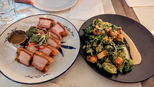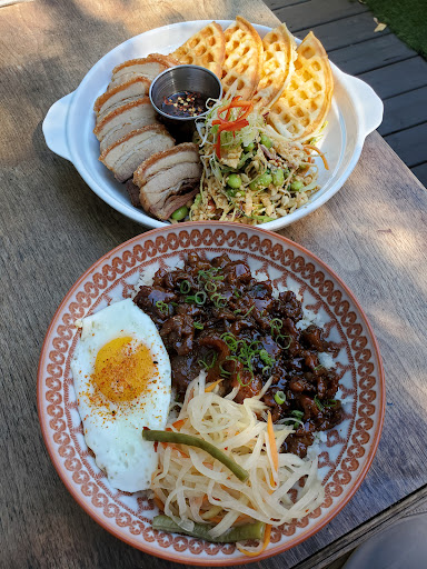 As for the food, we ordered the lechon and waffles, the tocino and the taho dessert. The lechon's skin had a very nice crisp to it and very meaty, but not as greasy as I'm used to. Lechon is lechon, I just can't hate it, no matter how it's prepared. The waffles on the other hand were great as well, very bouncy and light, with a texture that ressembles that of a cake. I believe their waffle mix had some hints of coconut in it, which was surprising and at the same time not a bad idea. The salad that came with the dish was also surprisingly fantastic, I loved the sauce, I believe it was some kind of peanut vinaigrette. The tocino was recommended by our very friendly waitress, which was in my opinion the best of the two main dishes we ordered. The marinated pork was a nice surprise, a little sweet, on top of a bed of garlic rice to help cut down on the sweetness of the pork, paired with a papaya salad and a fried egg. Very simple dish, but I enjoyed the heck out of it. The taho is the perfect dessert for people who have a sweet tooth and are feeling a little adventurous, as it is a little exotic and not necessarily a very commonly seen dessert if you're not well accustomed to Asian cultures. It's basically tofu that has a consistency similar to that of Jello, that has been drowned in melted sugar, garnished with tapioca balls and I believe some blueberries were also used in the making of the sauce.