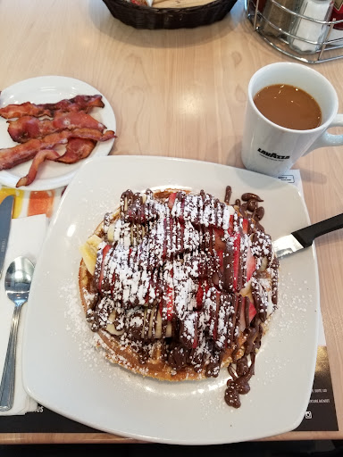 Very good food and coffee. I had a cheddar bacon pancake with potatoes which was excellent. My bf had the nutella banana bacon waffle and an orange and grapefruit juice and it was very good too. Lots of condiment choices, and I like that they put the season salt on the table in case you dont want any on your potatoes but I forgot to try it! Kind of pricey but the portions are huge so just show up really hungry and you wont br disappointed. Pros- friendly staff -really bright cheerful place -fast service (took longer to choose my food then get it) -huge menu selection, including drinks Cons -bit pricey -really packed, but tables not crowded (but it's a sign of a good place! Plus I went on a Sunday so its normal) -not much choice if you want a smaller breakfast