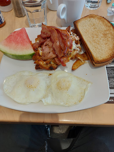 Not the greatest place to have breakfast. First of all, my sister and I were waiting quite long to be seated and there was no line up. There were several seats available however no one came to greet us. When we finally got seated , the waitress took very long to come take our order. Also, I am not a picky eater and I must say that this food was not good. The patatoes have absolutely no flavour. Also the eggs are watery. The brown bread is hard like a rock. There is also no space on the table and no one was around to ask for more napkins. Therefore , I decided to get up myself and take napkins from other tables. The waitress also never came to fill up our coffees. They all seem to be talking behind the bar and not paying enough attention to their clients. Lastly, there’s no one managing their staff or clients . I understand it is a new place and things may improve with time but since this is a new place there should certainly be a manager or director or someone in charge of the place to keep an eye on their staff and...