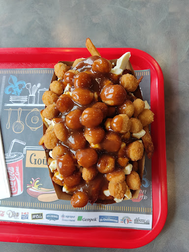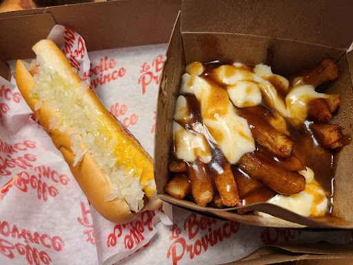 Our first time here checking out this new place. The 2 main gentlemen running this (& La Maison du Souvlaki) was super friendly and showed us around the establishment. They explained that the seating for the 2 restaurants are connected and there's also a taco menu and will soon offer fish and chips too. The seating area is bright and clean. There are souvlaki pitas for only $5 & it was delicious! Couldn't get a pic before it was eaten. My poutine was just ok, hence the 4 stars. But the hot dog was great! Would love to see the back area transformed into a beautiful terrasse next summer! Entrance to La Belle is on Papineau and entrance to Souvlaki is on Ontario if you want to be more direct as the order counters...