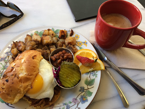 My absolute favourite brunch cafe in st-Henri. LOVE that there's live jazz during brunch; what a great atmosphere. The food is so good, not pretentious, but interesting enough combinations and flavour to even the simplest dishes that adds really nice extra touch without steering too far away from a typical breakfast/brunch. The prices are also equally great compared to most other places in the area; you actually feel like you're getting something reasonable for what you're paying (even if it might not be expensive ingredients. To me, brunch should not be something so fancy that it costs $16 for a piece of toast with chopped shrimps and mackerel on top. Even though that's delicious, it's not brunch to me). Finally, the atmosphere is incredible! It feels like I'm in my grandmother kitchen... super homey and cozy, friendly staff, and again the live music makes it amazing. The only problem I had with the place was that my friend who arrived 5 mins after me and went to the washroom before ordering, ordered 10 mins after I did and got his simple eggs and a bagel 40 mins after I had my breakfast and had already finished. Service in that was extremely slow, thus the 4...