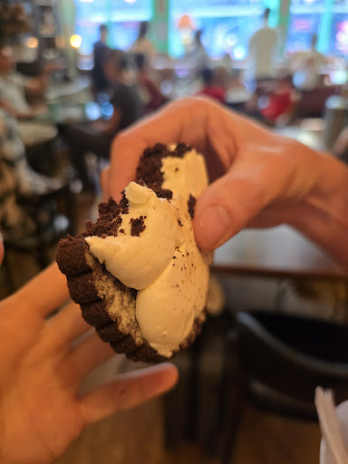 We ordered an iced coffee and the giant Oreo. Unfortunately, the giant Oreo although extremely intriguing was a bust. The cookie was so thick and so dry. It did taste like it was made with black cocoa so it did have that Oreo flavor but we literally had to take off the top cookie to even render it edible at all. The cream was good and it helped. But I'm so shocked that they had that for sale because I would be hard pressed to believe that anybody liked the sandwich as it was sold.