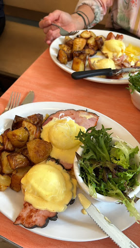 The service was impressively fast, and since we were both famished, we dove right into our meals. I'm happy to confirm that these eggs benedict are indeed among the best I've had in Montreal (perhaps even the best!). The sauce was perfectly cooked, the eggs were just right—not too hard, not too runny—and the ham added a delightful layer of flavor to the dish. The accompanying salad had a delicious, slightly sweet dressing that perfectly contrasted the savory eggs. The potatoes were good, better than most places, but the star was definitely the eggs benedict.