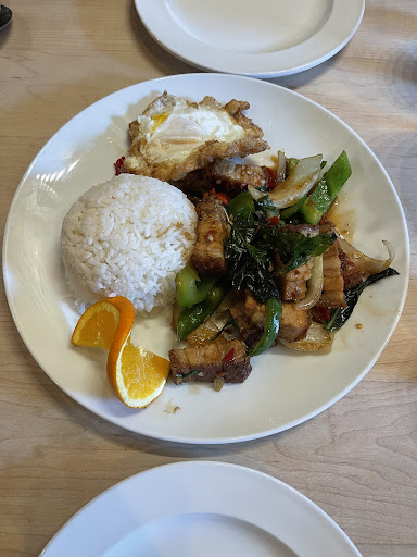 Crispy Pork Thai Basil Stir-Fry The crispy pork Thai basil stir-fry was another highlight, offering a savory, aromatic experience. The pork was cooked to perfection—crispy on the outside but still tender and juicy on the inside. The basil added a fragrant, herbaceous kick to the dish, complemented by the perfectly balanced mix of spices. The stir-fry had just the right amount of heat and sweetness, with a touch of savory umami that tied everything together. The portion was substantial and well-rounded, making for a satisfying main course. I loved how the dish showcased the bold flavors of Thai cuisine without being overwhelming.