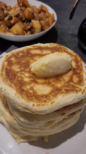 Read moreThis spot lured me in with their posting on pancakes! I kid you not! I was looking and saying to myself, “It’s pancakes, ok?” Well I made my way there finally and let me tell you…..IT’S PANCAKES! The stack was the most fluffy, light and filling batch of hotcakes I have ever come across and I make great pancakes! When the real maple syrup hit those stacks you will have a hard time putting your fork down, it keeps you going back for that next bite, y’all! I also ordered scrabbled eggs with bacon and was not disappointed when the plate came to the table and I saw 👀 the bacon 🥓 not your standard see-through, thinly sliced bacon this was 2 generous slabs of bacon cooked perfectly and was so satisfying I shed a tear 🥲of thankfulness. My partner had the omelette and the moment he took a mouthful he was in his zen, which was enlightened to another level by those breakfast potatoes with the everything bagel seasoning on them, to die for people! 🤤. It was hot today that the bottled water given to us when we arrived was just enough but as we ate we decided a meal this good needs a coffee to close it out. Yo! Even the coffee was on point! It was so good to the last drop. Our waitress was outstanding and it was nice watching our meal being prepared by the owner/chef. He is on his game and I hope he will be there for a long time! 😘 OMG...