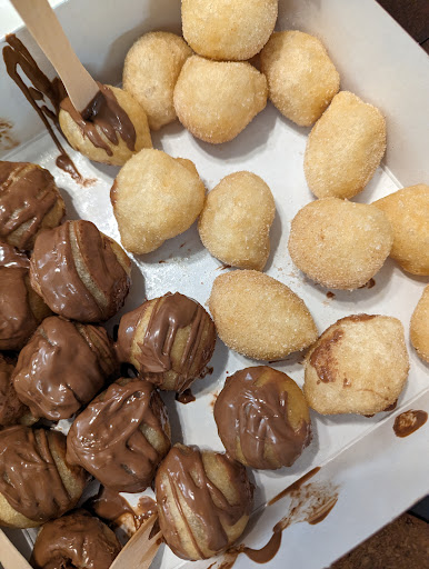 Read moreOn this particular day after soup at Pho My My, I was unable to resist Mr. Puffs The fresh, fried Greek pastry balls(!loukourmades) are a dessert hard to resist.Like the Krispy Kreme fad years ago,I went with a certain reservation at the expense of my waist line. The interior is bright ,filled with color and professionally decorated. Their smallest box of 12balls,( half double chocolate and half egg nog) were easily finished along with a most delicious capaccino.An endless stream of Mother's buying for their kids was observed .The Greek puffs when eaten fresh are very tasty but oily. At home ,warmed very briefly in the microwave, the pastry retains it's soft yummy interior.Ironically I'd go back to Mr. Puffs for the coffee and the very knowledgeable young lady at the cash while leaving the pastries to those who are young and who can more easily burn...