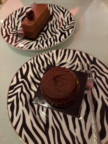 Desserts at Nile Bleu offer a refined close to the meal. The raspberry mousse is glossy and smooth, with just the right amount of tartness to cut through the richness. The pecan chocolate cake is dense, nutty, and indulgent without being overwhelming. Each dessert is plated with precision and care, served on zebra-print china that feels playfully luxurious.