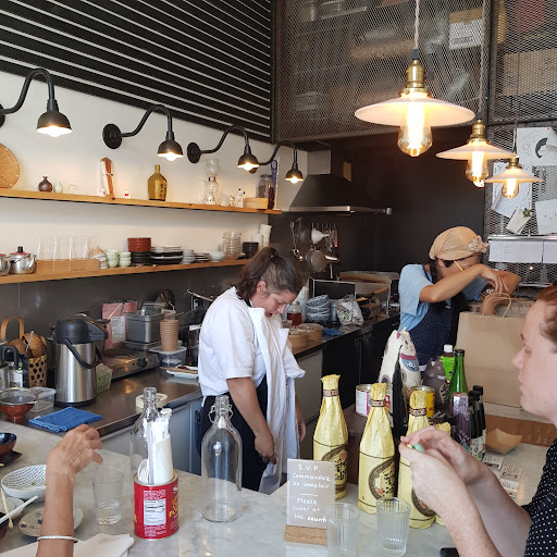 On the menu: • Oyako Chazuke (Weekly special): Salmon rice dish, ikura, mizuna, nori, shiso and wasabi, with dashi broth poured over the top. • Kamo Soba (Weekly special): Buckwheat noodles a dashi broth with slices of grilled duck, leeks, green onions, lemon zest and yuzu kosho. • Tonjiru (Weekly special): Soup with pork and root vegetables in a miso broth. Served with rice and small marinated vegetables. • Udon (Weekly special): Pulled chicken, cucumber, green onions, sesame sauce and J'ai Feng red oil. • Okonomiyaki: Cabbage patty with choice of Pork and/or shiitake filling. • Takoyaki (Octopus fritters). • Nasu Agebitashi: Eggplant marinated in soy, mirin and dashi. • Tataki Salad: Albacore tuna-with ponzu vinaigrette. • Potato salad with marinated egg and mustard soy sauce. • Miso Shiru (Miso soup with vegetables) • Goma Kyuri (Cucumbers and sesame) • Onigiri (Seasoned rice balls) • Tofu: Cold tofu with soy sauce, bonito, shiso and grated ginger. • Kashiwa Mochi • Matcha oat latte