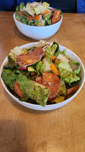For the wrap, I always choose the Djaj one. There's chicken taouk, garlic sauce, turnips, and pickles. The wrapped is grilled, and that gives a nice crunchy bite to it. The salad I got is the fattoush. I love this salad. There's lettuce, cucumber, pepper, radish, tomatoe, crispy pita, and pomegranate syrup based vinaigrette.