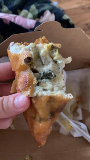 The Chicken Bourak. First off, Bourak is such a tremendous discovery. Its a fried? but crispy pastry with a delicious gooey egg, cream cheese, and perfectly blended vegetables, spices, and meat inside .